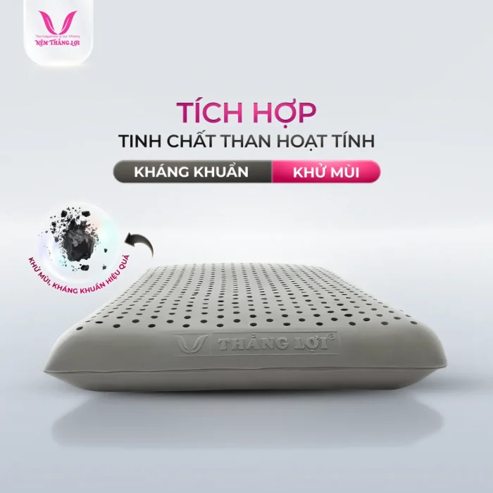 Trong gối nằm 100% Cao Su Thiên Nhiên Thắng Lợi BoBo, than hoạt tính được phối hợp tinh tế bên trong lõi cao su, tối ưu khả năng kháng mùi, hạn chế vi khuẩn và duy trì bề mặt gối sạch sẽ theo thời gian.