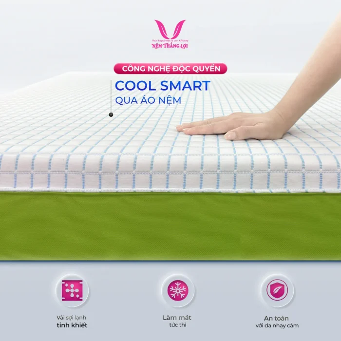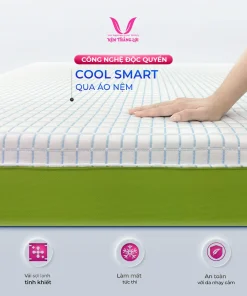 Sản phẩm ứng dụng cấu trúc Hybrid đa tầng, kết hợp giữa cao su thiên nhiên tích hợp tinh chất trà xanh, lõi foam cao cấp, và công nghệ áo nệm sợi lạnh tinh khiết Cool Smart mang đến 3 trải nghiệm vượt trội: Thoáng mát hơn – Nâng đỡ tốt hơn – Điều hòa nhiệt thông minh – Bảo vệ cột sống hiệu quả hơn.